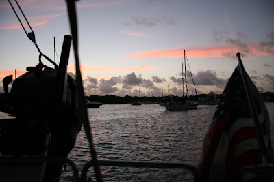 Here we are playing follow the leader. If you click on the picture, you can see Kristen and Casey ahead of us in the dinghy sounding out the channel to Bimini Sands. It's all the way to the left of the leftmost rock formation. It turned out that we had 7' of water (and could have had a little more) at high tide, so we were fine.